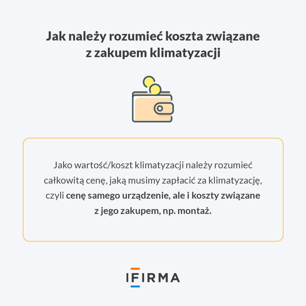 Jako wartość/koszt klimatyzacji należy rozumieć całkowitą cenę, jaką musimy zapłacić za klimatyzację, czyli cenę samego urządzenie, ale i koszty związane z jego zakupem, np. montaż. Co jeszcze należy wziąć pod uwagę przeczytasz w artykule: Środki trwałe w działalności a wartość początkowa.