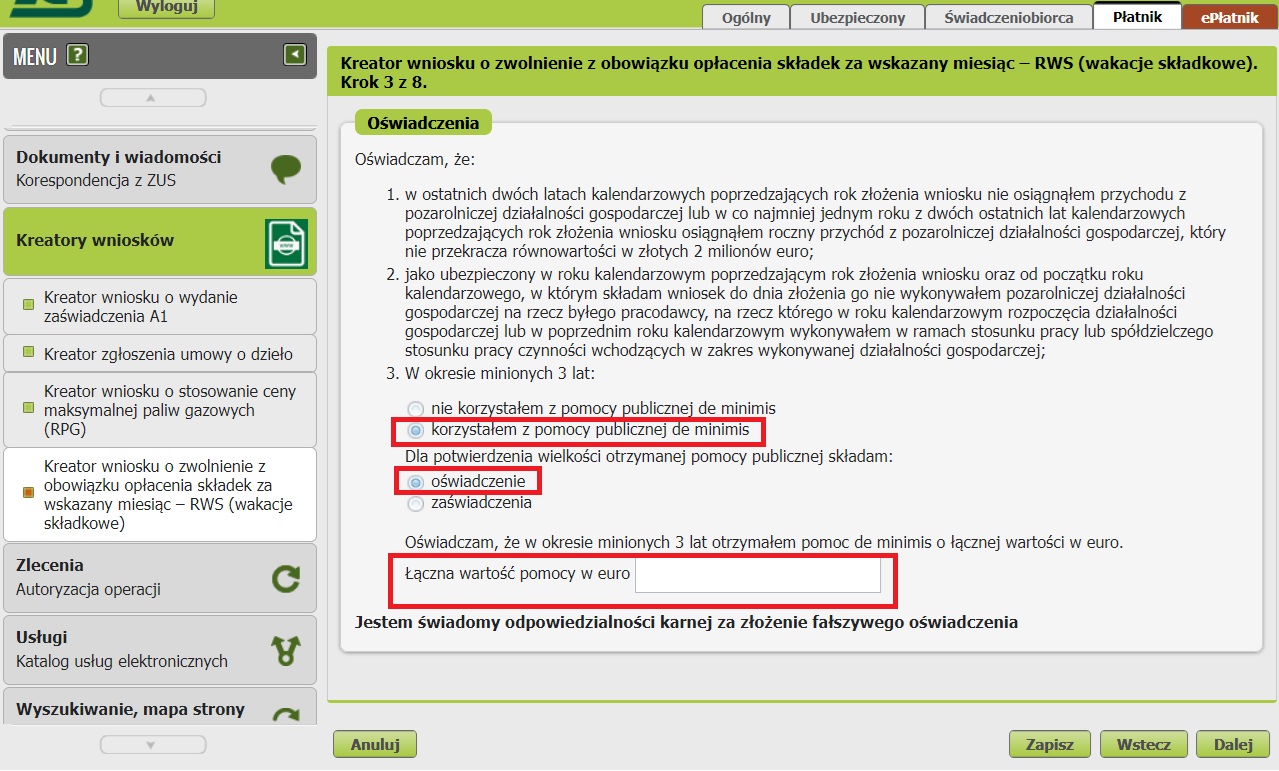 Wakacje od składek ZUS – Zrzut z kreatora wniosku RWS