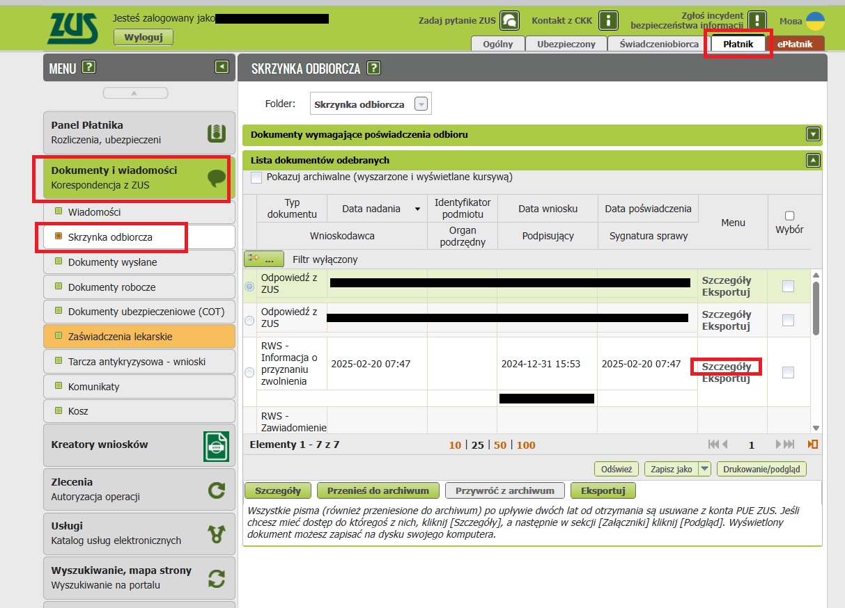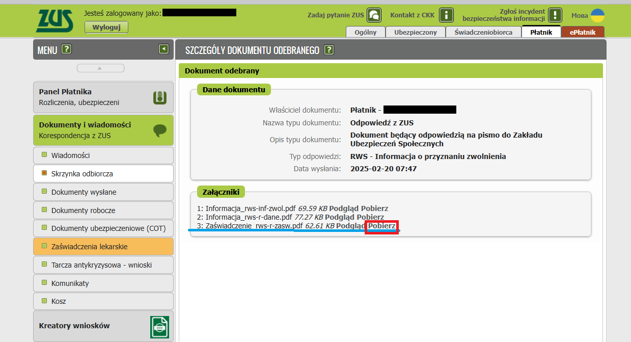 Żeby znaleźć zaświadczenie na eZUS (PUE-ZUS) należy przejść do zakładki Płatnik i po prawej stronie wybrać Dokumenty i wiadomości – Skrzynka odbiorcza. Następnie odnaleźć pismo RWS – informacja o przyznaniu zwolnienia i w kolumnie Menu kliknąć Szczegóły.