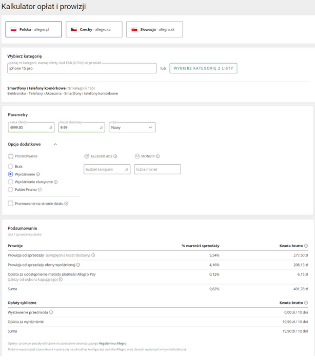 koszt przesyłki – jeśli kupujący płaci za dostawę, jest ona doliczana do prowizji; przy Allegro Smart! prowizja obejmuje tylko cenę towaru.