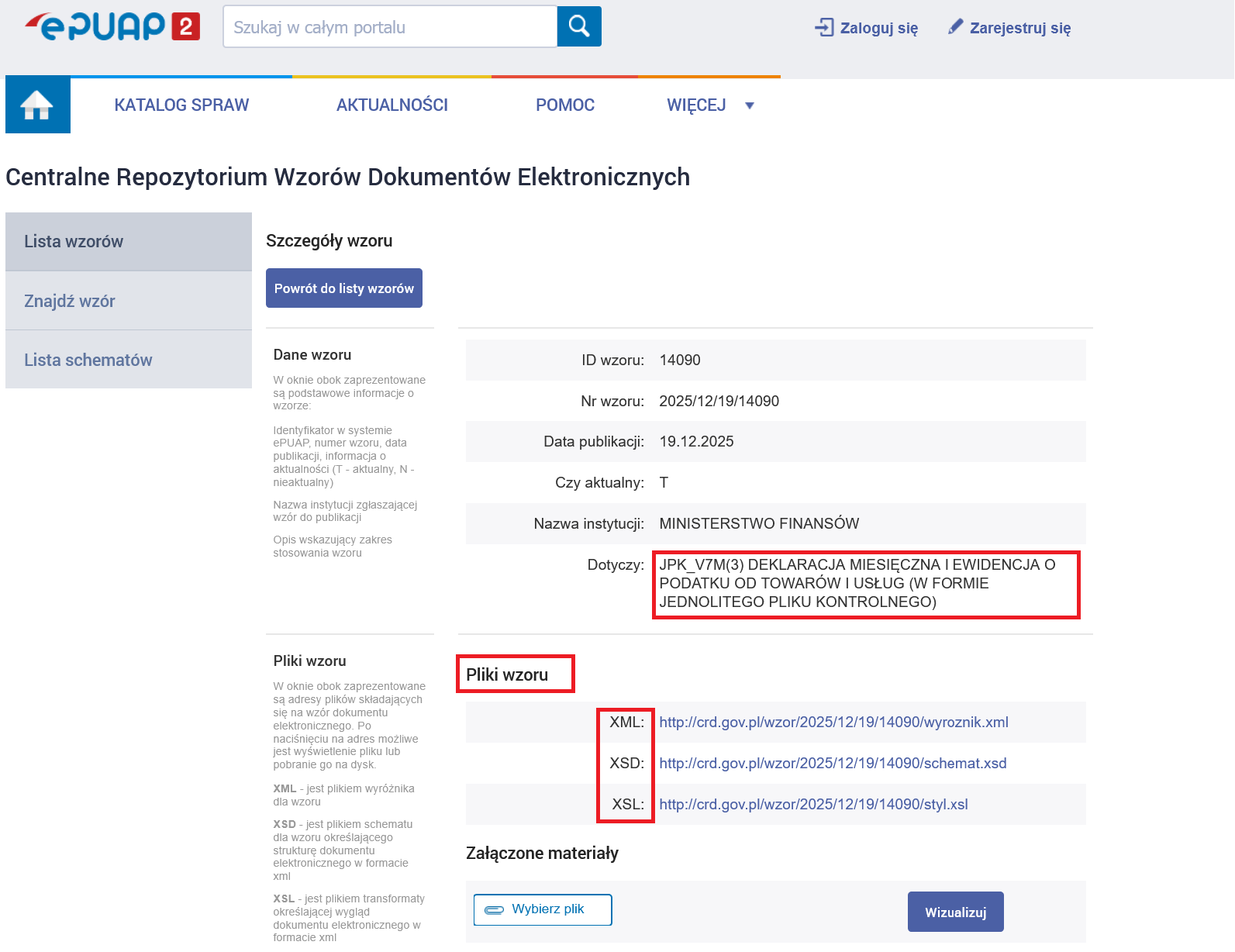Poniżej zaprezentowano wzór JPK_V7M z plikami wzoru, który jest dostępny na stronie CRWDE.