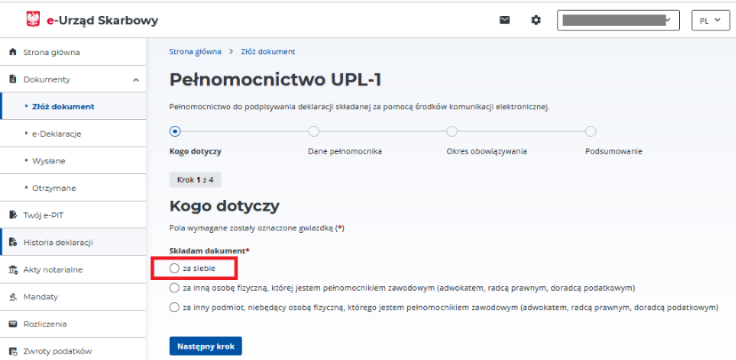 Przechodzimy do wypełnienia Pełnomocnictwa, dokument należy złożyć we własnym imieniu, a więc zaznaczamy kwadrat “za siebie” i przechodzimy do następnych kroków.